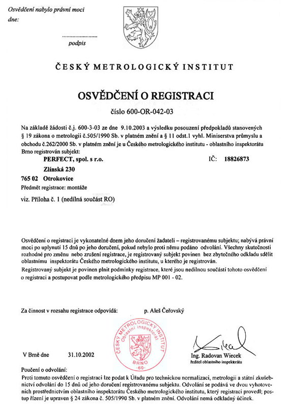Společnost má zaveden a od 9/2002 certifikován systém řízení jakosti dle normy ISO 9001 (certifikát).
